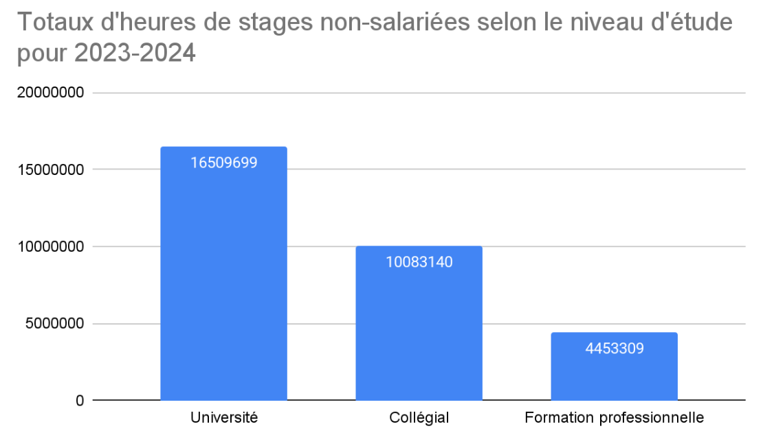 En somme, les étudiant-e-s à la formation universitaire, collégiale et professionnelle réalisent ensemble plus de 31 millions d’heures de travail en stage non-rémunéré annuellement. De ce nombre, approximativement 20 millions d’heures sont réalisées dans le secteur public ou parapublic et 6,5 millions dans une entreprise privée.[32]