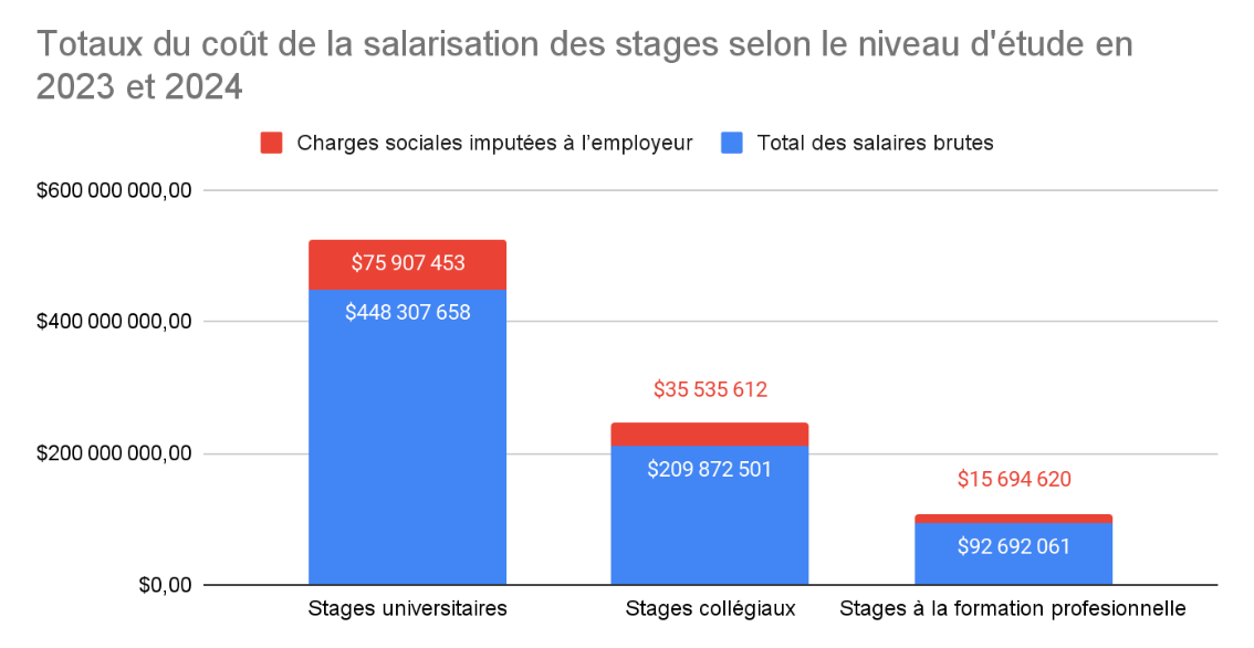 - La salarisation de tous les stages, autant à la formation professionnelle, au collège et à l’université, pour l’année 2023-2024 coûterait environ de 878 millions $ en salaire et en charges sociales si l’ensembles des stages universitaires étaient rémunérés à 27,15$ de l’heure et les stages de la formation technique et professionnelle étaient rémunérés à 20,81$ de l’heure.